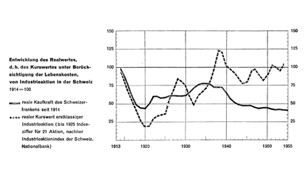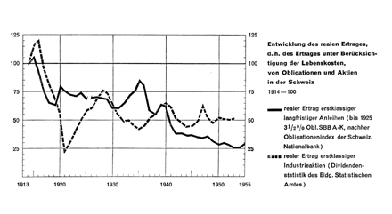 Die Charts beziehen sich auf die ereignisreiche Zeit von 1914 bis 1955. Folgende Ereignisse prägten diesen unruhigen Zeitabschnitt (Bemerkung: Aussagen zur Konjunktur und Inflation beziehen sich auf die Schweiz): 1. Weltkrieg | Nachkriegsjahre mit Rekordinflation | Wirtschaftsaufschwung | Grosse Depression (Deflation/Rezession) mit anschliessender Stagnation | 2. Weltkrieg mit Wirtschaftsabschwung zu Kriegsbeginn begleitet von hoher Inflation und einem im weiteren Kriegsverlauf kräftigen Wirtschaftsaufschwung und tieferen Inflationsraten | Nachkriegszeit mit Konjunkturberuhigung | Beginn eines kräftigen Konjunkturzyklus - Wiederaufbau in Europa. Wie also haben die Wertpapiere in Übersee und in der Schweiz auf die vielfältigen Entwicklungen im Zeitablauf reagiert? Hier die visuelle Antwort: Schweiz: Kaufkraft und Reale Aktienkursentwicklung